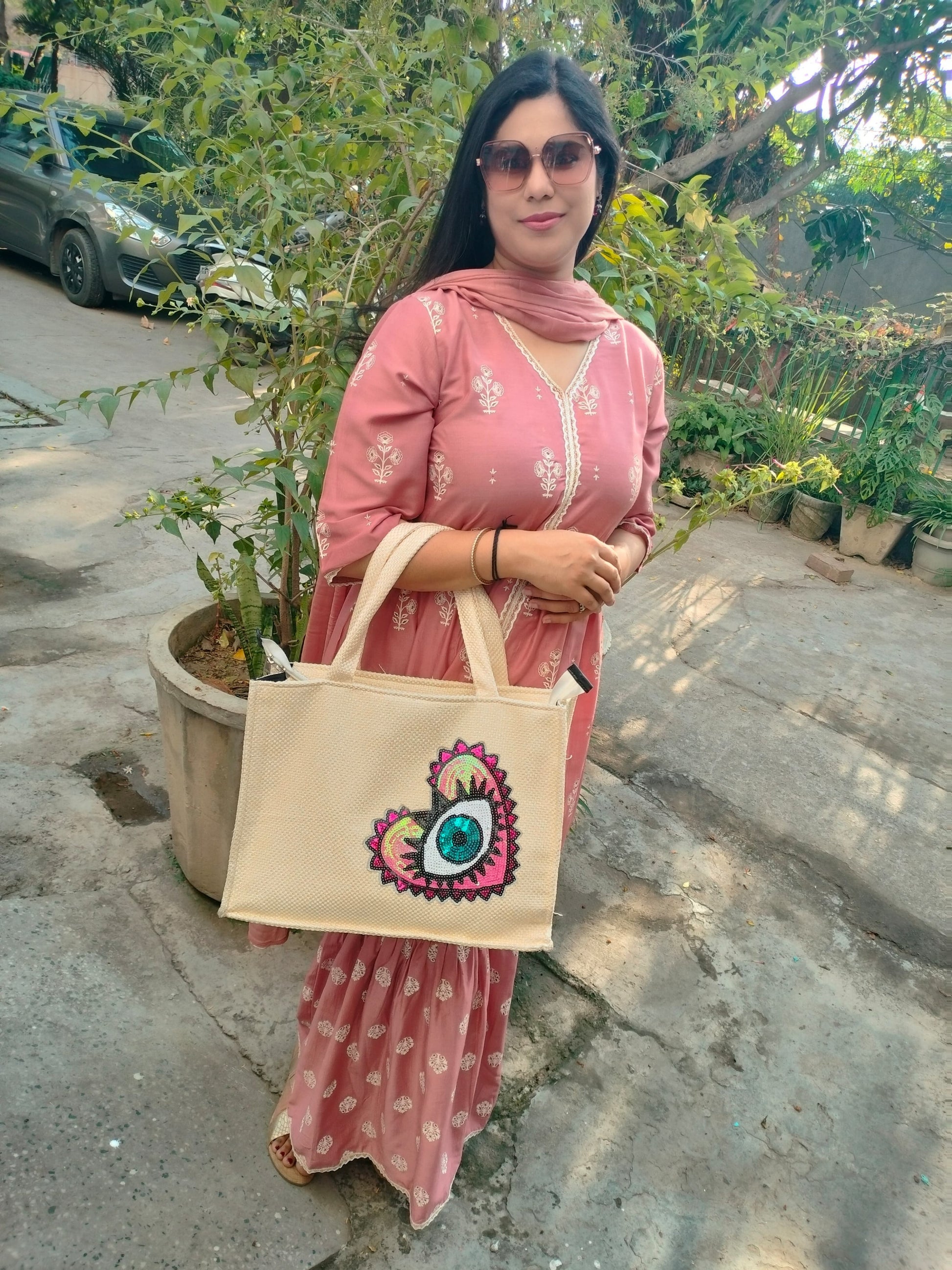 - Material: Crafted from durable and eco-friendly jute material, this tote bag offers both style and sustainability. Jute is known for its strength and resilience, making it ideal for daily use.